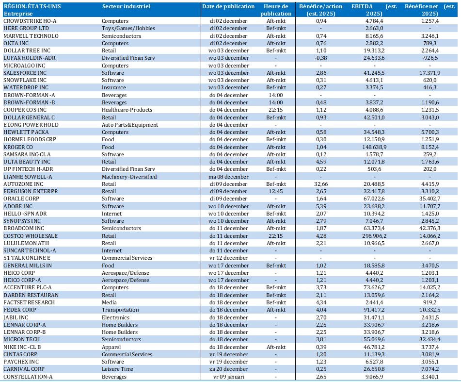 - Hier, les marchés boursiers ont éprouvé des difficultés à se donner une orientation : l'Euro Stoxx 600 a perdu quelque 0,2 % alors que Wall Street enregistrait une perte entre 0,5 % et 0,9 %. Les marchés ont donc baissé un peu, mais sans grande conviction. Les thèmes centraux relatifs à certaines actions, et que nous évoquons depuis plusieurs semaines, n’ont pas changé (craintes liées à l'IA, possibilité d’une baisse de taux aux États-Unis en décembre, etc.), aussi nous abstiendrons-nous de toute exégèse.