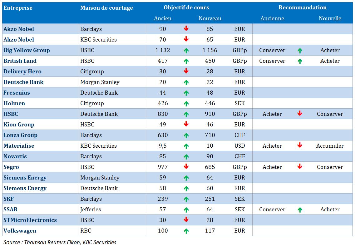 - Akzo Nobel {{1934316, AKZO NOBEL NV, AKZA}} : l'analyste de KBC Securities a examiné les chiffres d'Akzo. Après une croissance modérée des bénéfices dans un passé récent, Akzo se concentre désormais sur l'ajustement de son portefeuille. Compte tenu des économies brutes résiduelles (minimales) de 405 millions d'euros encore prévues d'ici 2027, la direction prévoit d'améliorer sa marge EBITDA ajustée de 220 points de base (à 16 %) dans les années à venir. Les attentes de KBCS et la moyenne des prévisions des analystes sont plus prudentes, s'établissant respectivement à 15,3 % et 15,6 % d'ici 2027. La rationalisation prévue du portefeuille devrait se traduire par la cession de l'activité Deco Paints, en Inde (produit attendu supérieur à 1 milliard d'euros). Le produit de cette cession servira a priori à poursuivre les efforts de réduction de la dette et à des rachats d'actions. KBCS maintient sa recommandation « Conserver », mais abaisse l'objectif de cours à 65 euros au lieu de 70 euros.
