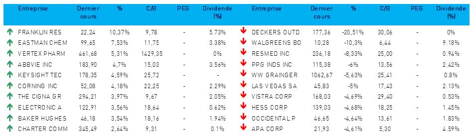 - Chevron {{4013353, CHEVRON CORP., CVX}} : le groupe pétrolier américain annonce pour le quatrième trimestre des résultats en baisse, avec un bénéfice ajusté par action de 2,06 dollars inférieur aux attentes moyennes des analystes (2,11 dollars). Dans son pôle aval, Chevron subit une perte de 248 millions de dollars, au lieu d’un bénéfice de 1,15 milliard de dollars il y a un an. La production du bassin permien a augmenté de 14 % pour atteindre le chiffre record de 992 000 barils équivalent pétrole par jour. Chevron augmente don dividende trimestriel de 5 %, à 1,71 dollar par action, et confirme son intention d'accroître son flux de trésorerie disponible de 10 milliards de dollars au cours des deux prochaines années.