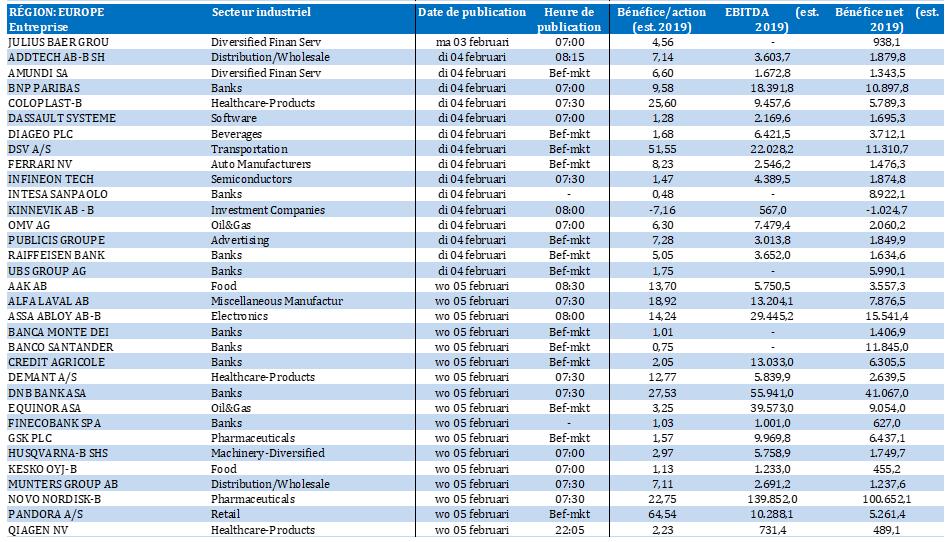 - Novo Nordisk {{7239032, NOVO NORDISK A/S, NOVO B}} anticipe une progression de 20,3 % de son chiffre d'affaires à 65,86 milliards de couronnes danoises. Les analystes s'attendent à un bénéfice par action de 5,84 couronnes danoises. Novo Nordisk publiera ses chiffres le 5 février.