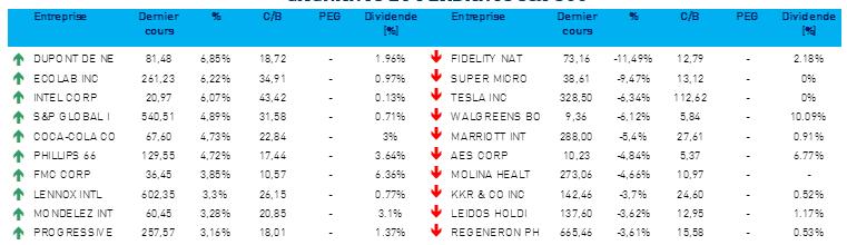 - Coca-Cola {{258521, THE COCA-COLA CO., KO}} : l’action du célèbre fabricant de boissons non alcoolisées a gagné plus de 3 % après la publication, pour le quatrième trimestre, de résultats supérieurs aux estimations de Wall Street. Sur le trimestre, Coca-Cola a en effet réalisé un bénéfice ajusté par action de 0,55 dollar sur un chiffre d'affaires de 11,54 milliards de dollars. Les analystes s'attendaient à 0,52 dollar pour un chiffre d’affaires de 10,68 milliards de dollars. Toujours au quatrième trimestre, le chiffre d’affaires net comparable a augmenté de 4,2 % à 11,40 milliards, alors que les analystes s'attendaient à un recul de 2,47 %.