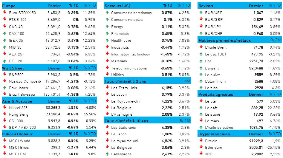 - Les taux d'intérêt ont de nouveau baissé aux États-Unis, à 4,38 % pour le taux à 10 ans et à 4,15 % pour le taux à 2 ans. Ces niveaux sont nettement inférieurs à ceux du 13 janvier, quand le taux à 10 ans culminait à 4,8 % et le taux à 2 ans, à 4,4 %. Baisse des craintes d'inflation, ralentissement de l'économie, impact négatif de la guerre des droits de douane, fuite vers la sécurité, etc. : toutes ces raisons peuvent l’expliquer, mais le fait est que le dollar US est resté de marbre hier (1 € = 1,0474 $), tandis que Wall Street perdait entre 0,5 % (S&P500) et 1 % (Nasdaq).