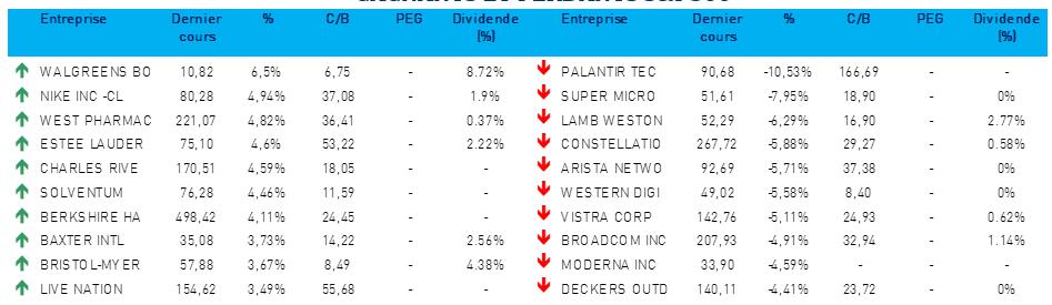 - Berkshire Hathaway {{255747, BERKSHIRE HATHAWAY INC., BRK.B}} : l’action du conglomérat dirigé par Warren Buffett a atteint son cours le plus élevé après l’annonce du bénéfice trimestriel le plus élevé de son histoire, grâce à l'amélioration de ses activités d'assurance. Le cours de l’action de catégorie A atteignait 747 485,49 dollars à la clôture, en hausse de 4 %, tandis que l’action de catégorie B s’élevait à 498,42 dollars. Le bénéfice net, y compris les gains et pertes sur le portefeuille d’actions, s'élève à 89 milliards de dollars. Le management a révisé à la hausse ses prévisions de bénéfices pour 2025, aidé par l'amélioration des performances de la compagnie Geico.