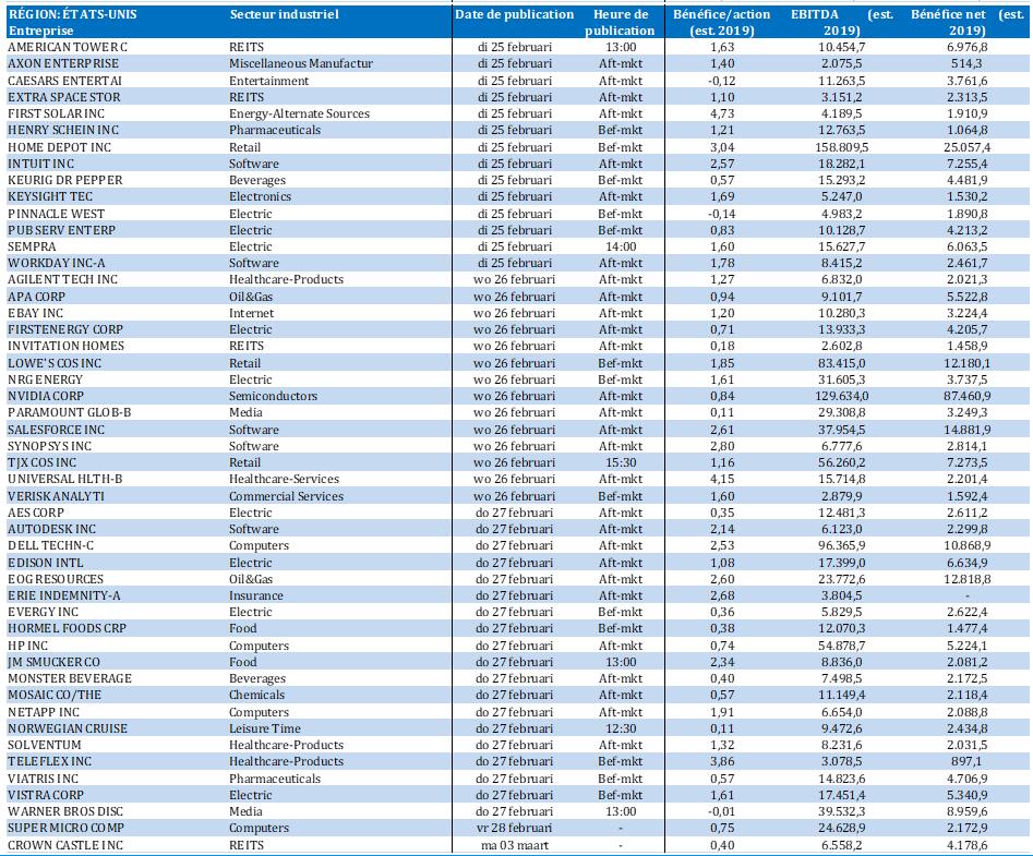 - Zoom Communications {{251857462, ZOOM COMMUNICATIONS INC., ZM}} : le fournisseur de services de vidéoconférence prévoit pour le premier trimestre et pour l’exercice un chiffre d'affaires inférieur à la moyenne des attentes des analystes, car les entreprises prennent progressivement leurs distances à l’égard des modèles de travail hybrides. Zoom prévoit pour 2026 un chiffre d'affaires compris entre 4,79 et 4,80 milliards de dollars au lieu de la moyenne des attentes des analystes (4,81 milliards de dollars). Pour le quatrième trimestre, clos le 31 janvier, le chiffre d’affaires atteint le niveau – conforme aux attentes – de 1,18 milliard de dollars. En base ajustée, Zoom réalisé un bénéfice de 1,41 dollar par action, alors que les analystes s'attendaient en moyenne à 1,30 dollar.
