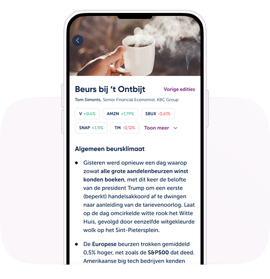 Tom Simonts, Senior Financial Economist bij KBC Securities, gidst je elke dag door het belangrijkste nieuws dat het algemene beursklimaat bepaalt. Hij legt uit wat de cijfers betekenen, welke trends de markt aansturen en duikt zowel in nationale als internationale ontwikkelingen. Zo begrijp je meteen wat er speelt en blijf je een stap voor op de rest!