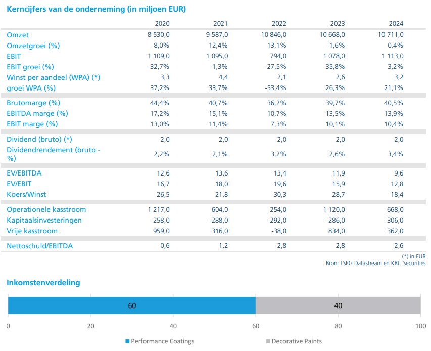 - Het Nederlandse verf- en coatingsbedrijf gaat een fusie op aandelenbasis aan met Axalta, waarmee het de op één na grootste speler wereldwijd wordt na Sherwin-Williams. De combinatie biedt een sterke strategische fit dankzij Axalta’s positie in Automotive OEM & Refinishes en mikt op 600 miljoen dollar aan synergievoordelen. Ondanks de voordelen blijft de sector laag-groeiend. Geen impact op de “Houden”-aanbeveling en koersdoel van 65 euro.