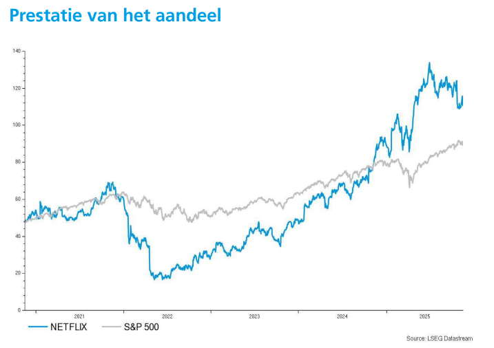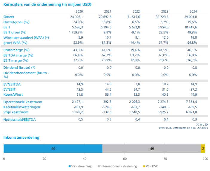 Aangezien Netflix het overgrote deel van zijn inkomsten uit abonnementen haalt, is het binnen de mediasector één van de meest defensieve bedrijven. Het lijdt ook geen twijfel dat Netflix wereldwijd de onbetwiste leider is in streaming entertainment. KBC Securities-analist Kurt Ruts denkt evenwel dat deze leidende positie van Netflix is ingeprijsd. Hij blijft bij de "Houden"-aanbeveling. Het koersdoel deelt hij door tien omwille van de aandelensplitsing en wordt dus 115 USD.