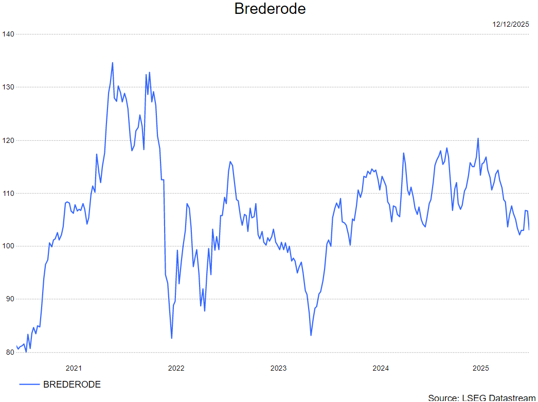 - De Belgische investeringsmaatschappij zag de groei terugkeren nu de negatieve impact van wisselkoersen afneemt, wat een verhoging van de aanbeveling bij KBCS van “Houden” naar “Opbouwen” rechtvaardigt. De intrinsieke waarde per aandeel steeg in het derde kwartaal met 2,5% tot 138,5 euro, ondanks een verlies van 44,1 miljoen euro over 9 maanden, waarbij de private portefeuille een positief waardeverloop van +34 miljoen euro in het kwartaal liet zien en de beursgenoteerde portefeuille een winst van 97 miljoen euro YTD boekte. Met een korting van circa 28% tegenover de intrinsieke waarde en een sterke operationele dynamiek blijft Brederode aantrekkelijk, ondanks blijvende onzekerheid rond de EUR/USD-koers. Het koersdoel blijft ongewijzigd op 125 euro.