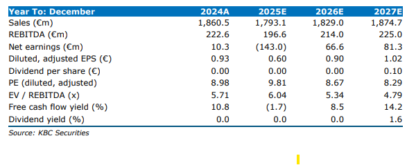 - De Belgische retailer heeft een meerderheid bereikt voor een collectieve overeenkomst rond een jobbeschermingsplan in het kader van de verkoop van zijn Franse winkels, wat zal leiden tot een herstructureringskost van 55 tot 65 miljoen euro (voor belastingen) na afronding van de transacties in 2H25/26. Naast de eerder aangekondigde putoptie met Groupement Mousquetaires voor 81 winkels en 44 tankstations, zijn er bijkomende overeenkomsten gesloten voor 19 extra winkels en 1 DATS-tankstation; er blijven nog 5 winkels en 3 magazijnen waarvoor een koper wordt gezocht. KBCS handhaaft de “Opbouwen”-aanbeveling en koersdoel van 41 euro.