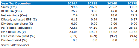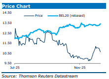 Kristof Samoy verlaagt het koersdoel naar 2,4 euro (van 3,1 euro) en handhaaft een “Houden”-aanbeveling. De analist blijft voorzichtig gezien het gebrek aan zichtbaarheid en geloofwaardigheid rond de groeidoelstellingen.