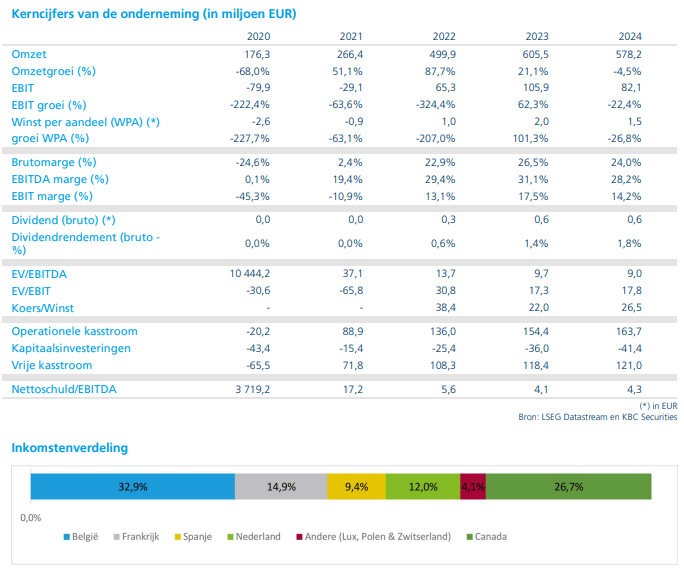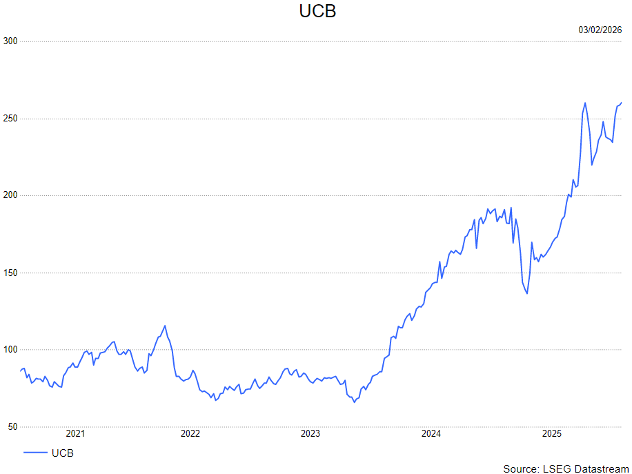 - UCB verhoogde in december 2025 opnieuw zijn vooruitzichten en verwacht nu meer dan 7,6 miljard euro omzet, een stijging van 24% jaar op jaar. De groei wordt gedreven door sterke prestaties van onder meer Rystiggo, Zilbrysq, Fintepla, Evenity en vooral Bimzelx, dat sterk momentum kent in hidradenitis suppurativa. Het aangepaste model van KBCS voorziet nu Bimzelx-verkopen van 2,128 miljard euro, boven de gemiddelde analistenverwachting. De aanbeveling gaat van "Opbouwen" naar "Kopen" met een koersdoel van 284 euro.