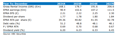 Het vastgoedportfolio steeg tot 3,56 miljard euro (vs. 3,31 miljard euro in 2024), een stijging van 7,4%, ondersteund door een herwaarderingswinst van 39 miljoen euro, voornamelijk door huurgroei. De NIY nam licht toe tot 4,8%, vooral door een gewijzigde landenmix. De bezettingsgraad bleef uitzonderlijk sterk op 98%.