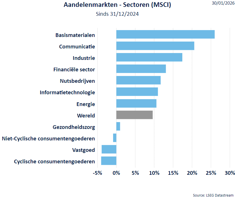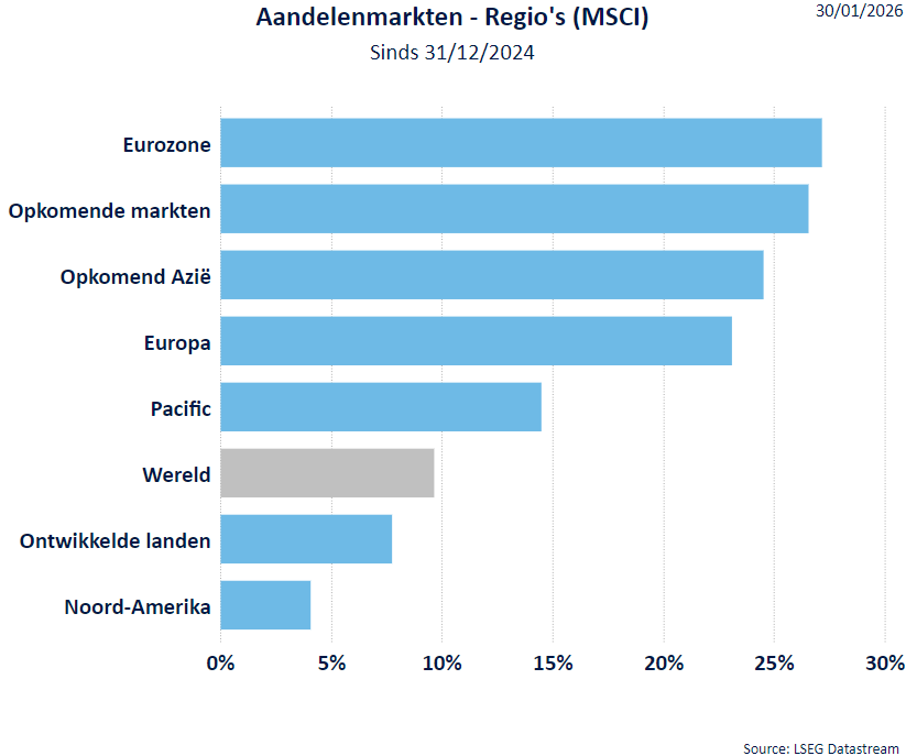 - In Europa bereikte de STOXX 600 een recordhoogte, doordat de recente turbulentie op de grondstoffenmarkten afnam en de aandacht verschoof naar bedrijfsresultaten van onder andere Amundi en Publicis. Aziatische aandelen stegen eveneens: de Japanse Nikkei veerde bijna 4% omhoog en Chinese aandelen sloten hoger, aangevoerd door bedrijven in bouwmachines en defensie.