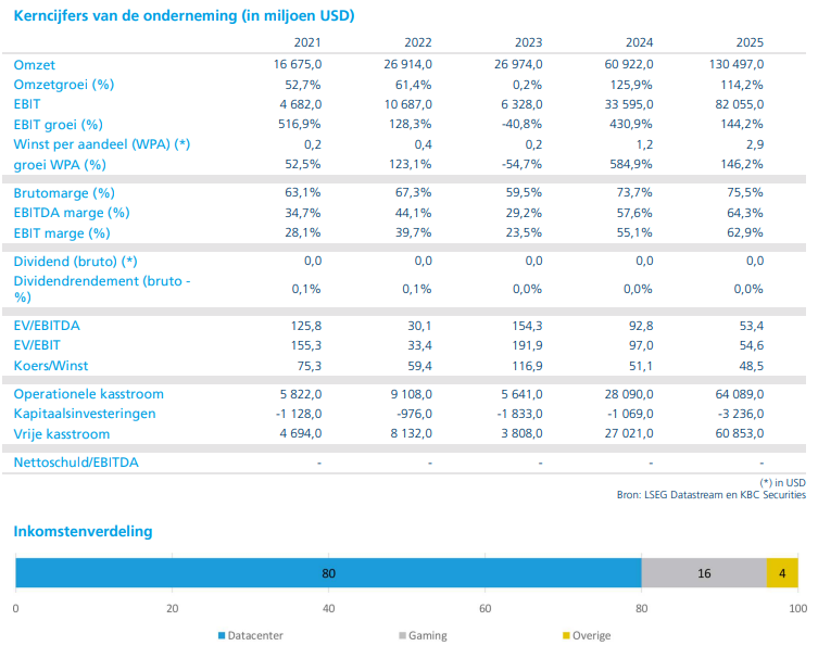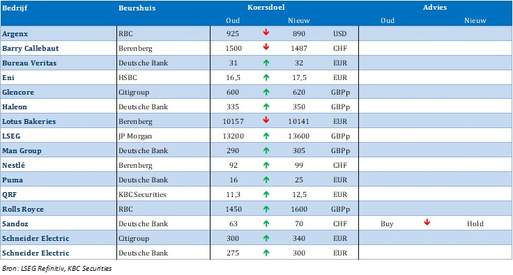 - De Belgische biotechgroep realiseerde in 2025 wereldwijde nettoverkopen van 4,2 miljard dollar, boven de gemiddelde analistenverwachting, en een operationele winst van 1,1 miljard dollar, waarmee het voor het eerst operationeel winstgevend werd. Een positieve oogheelkundige MG‑studie vergroot de behandelbare patiëntenpopulatie met 7.000. Met bijkomende klinische read‑outs in 2026 blijft het aandeel aantrekkelijk. KBCS handhaaft de “Kopen”‑aanbeveling en koersdoel van 900 euro.