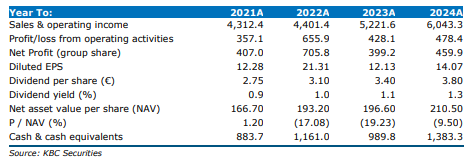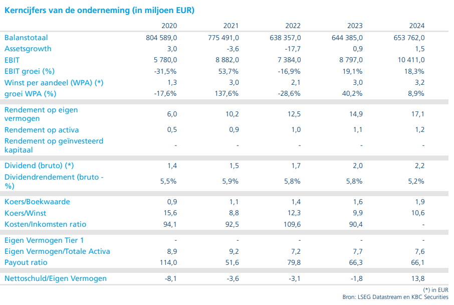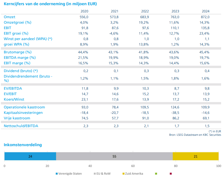 De nettoschuld daalde van 283 miljoen euro naar 180 miljoen euro (KBCS: 308 miljoen euro, gav: 273 miljoen euro), wat resulteert in een nettoschuld/EBITDA‑ratio van 0,4x. Het dividend wordt verhoogd naar 1,95 euro per aandeel (vorig jaar: 1,90 euro). In combinatie met het lopende aandeleninkoopprogramma van ongeveer 100 miljoen euro per jaar en de vrije kasstroomgeneratie komt het totaalrendement voor aandeelhouders uit op ongeveer 9 procent per jaar.