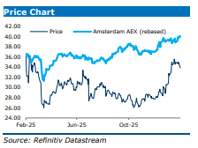 - De Nederlandse industriegroep zag in 2025 de omzet met 2,5% dalen, beter dan de gemiddelde analistenverwachting, terwijl de aangepaste EBITA met 410 miljoen euro in lijn bleef met de verwachtingen en de marge stabiel bleef op 13,3%. Ondanks een hoger dan verwacht dividend van 1,15 euro per aandeel blijft de vooruitblik voor 2026 voorzichtig. KBCS handhaaft de “Houden”‑aanbeveling en koersdoel van 33 euro.