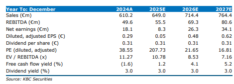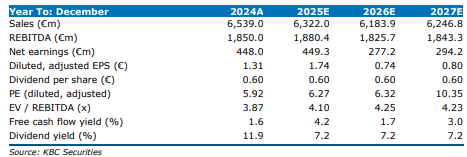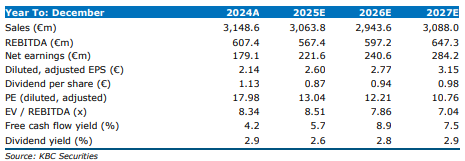 In het vierde kwartaal van 2025 daalde de omzet met 11,3 procent (‑5,6 procent organisch) tot 1418 miljoen euro (KBCS: 1507 miljoen euro, gemiddelde analistenverwachtingen (gav): 1472 miljoen euro). De volumes lagen ongeveer 5 procent lager dan vorig jaar. De onderliggende EBITDA daalde met 20 procent (‑17 procent organisch) tot 238 miljoen euro, wat 10 procent onder de verwachting van KBC Securities lag en 11 procent onder de consensus.