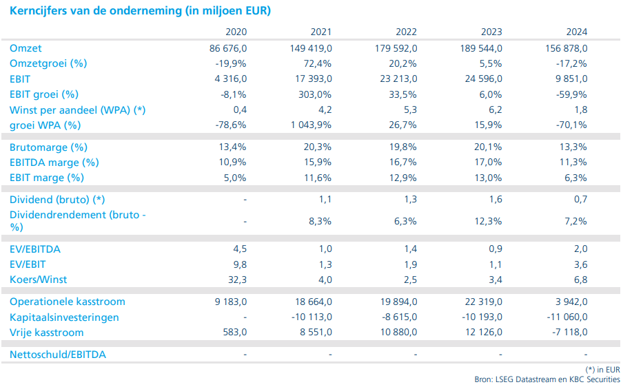 De omzet daalde in 2025 met 5 procent tot 1614 miljoen euro (KBCS: 1613 miljoen euro, gav: 1612 miljoen euro). De volumes stegen licht met 0,2 procent, geholpen door sterke activiteit in China in de tweede jaarhelft. In Europa en India waren de volumes lager, terwijl Noord‑Amerika in de tweede helft een stijging liet zien. De uEBIT daalde met 5 procent tot 142 miljoen euro, gesteund door blijvende kostenverbeteringen. De marktvraag voor bandenstaal bleef aan het begin van 2026 eerder zwak, vooral in Europa en Noord‑Amerika.