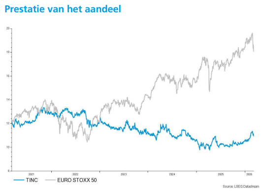 - De investeringsmaatschappij gespecialiseerd in infrastructuur noteerde stabiele resultaten voor 2025, gekenmerkt door een sterke portefeuille‑uitbreiding dankzij de volledige investering van de kapitaalverhoging van juni 2025. De reële waarde van de portefeuille steeg met 39,3 procent tot 713,2 miljoen euro, vooral door de inzet van 113 miljoen euro nieuw kapitaal. De nettowinst bedroeg 40,6 miljoen euro of 0,84 euro per aandeel, met sterke kasontvangsten van 75,8 miljoen euro en een nettowaarde van 637,5 miljoen euro. TINC wil zijn portefeuille de komende jaren laten doorgroeien richting 816 miljoen euro en op langere termijn 1,0 miljard euro. KBC Securities hanteert een koersdoel van 14 euro en een “Kopen”-aanbeveling.