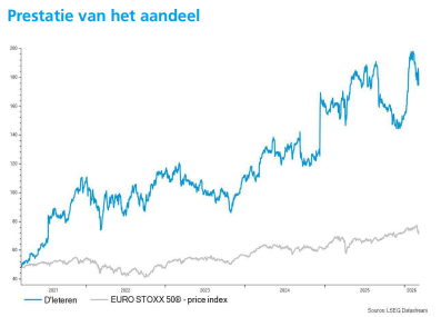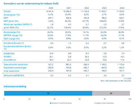 - De mobiliteits‑ en autodienstengroep rapporteerde sterke resultaten voor 2025, waarbij de aangepaste winst voor belastingen uit voortgezette activiteiten uitkwam op 956 miljoen euro, boven de verwachtingen en goed voor een vergelijkbare groei van 3,8 procent. De prestatie werd vooral gedragen door Belron, waar een uitzonderlijk hoge marge van 24,4 procent in de tweede jaarhelft de zwakkere eerste jaarhelft compenseerde, terwijl PHE in lijn presteerde en TVH Parts en Auto te maken kregen met margedruk. Voor 2026 rekent de groep op een beperkte tot middelmatige groei van de aangepaste winst voor belastingen, wat wijst op een voorzichtige vooruitblik door aanhoudende druk bij TVH en Auto, ondanks verdere verbeteringen bij Belron. KBC Securities handhaaft een koersdoel van 220 euro en een “Kopen”-aanbeveling.