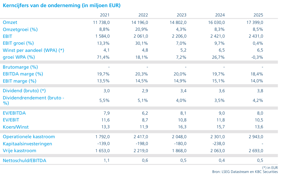 Aan 9 keer de verwachte winst voor 2026 kan het aandeel bezwaarlijk duur genoemd worden. De analist van KBC Securities, Kurt Ruts, bevestigt de kopen- aanbeveling maar verlaagt het koersdoel van 117 euro naar 104 euro.