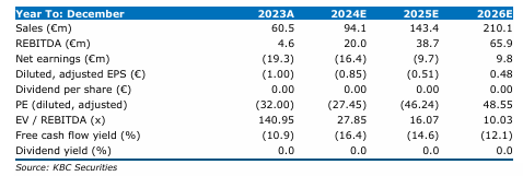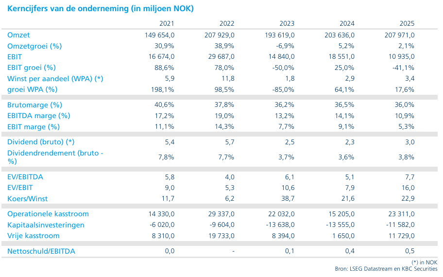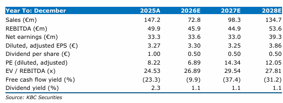 - Het bedrijf rapporteerde stevige vierdekwartaalresultaten voor 2025 met een aangepaste EBIT van 82,8 miljoen euro, licht boven de verwachtingen, wat het jaarniveau op 179,7 miljoen euro bracht, aan de bovenkant van de eerder vooropgestelde vork. Sterkere winstgevendheid bij Bpost compenseerde zwakkere prestaties bij Paxon. Voor 2026 voorziet het bedrijf een aangepaste EBIT van 165–195 miljoen euro, maar door een nettoverlies over 2025 wordt geen dividend uitgekeerd. Geen impact op de “Houden”‑aanbeveling en koersdoel van 2 euro.