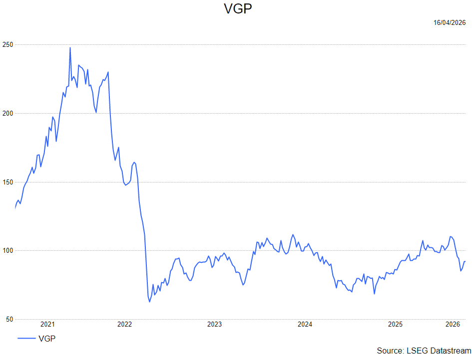 - De netto‑inventariswaarde bedroeg op 28 februari 2026 6,98 euro per aandeel, een daling van 0,2% tegenover eind januari en 1,0% sinds het begin van het jaar. De beurskoers sloot februari af op 4,42 euro, een stijging van 4,3% tegenover eind januari en 5,5% sinds het begin van 2026. De korting op de intrinsieke waarde daalde verder tot 36,6%.