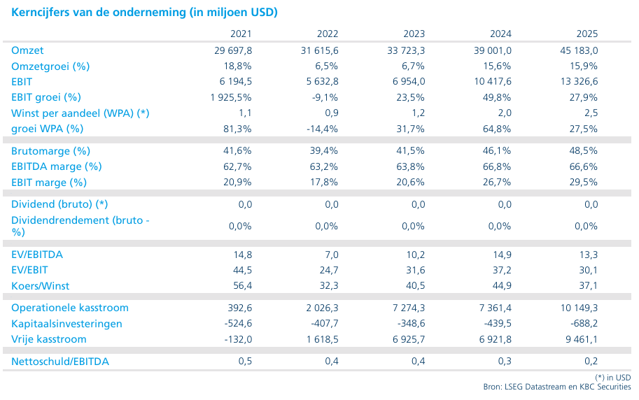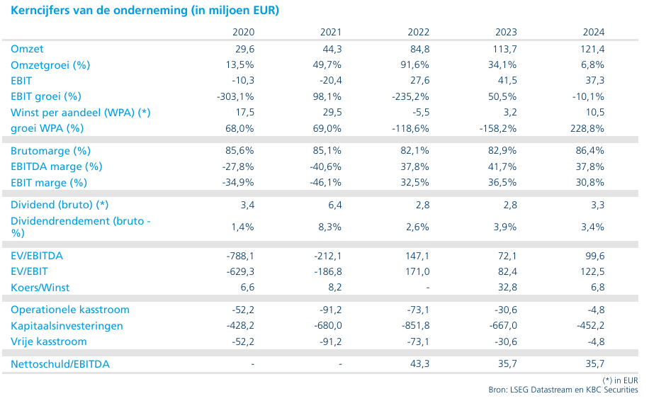 - De Belgische producent van industriële wasserij‑oplossingen bereikte in 2025 recordniveaus in omzet en winst, met een orderinstroom van 531,4 miljoen euro en een omzetgroei van 19,3% tot 540,8 miljoen euro. De uitvoering van de “Go West”‑ en “Go East”‑strategieën en overnames zoals GA Braun en Filterfab versterkten de internationale aanwezigheid en aftermarketactiviteiten, wat leidde tot een EBIT van 68,8 miljoen euro en een winst per aandeel van 6,26 euro. Met een sterk orderboek bij de start van 2026, een verhoogd dividend van 1,50 euro per aandeel en een koersdoel van 70 euro blijft KBCS bij een “Opbouwen”‑aanbeveling.