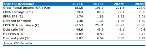 - Het vastgoedbedrijf rapporteerde een EPRA‑winst per aandeel die 1,7% lager uitviel dan verwacht, vooral door hogere investerings‑ en rentelasten na de Zweedse aankoop van 110 miljoen euro. Operationeel was er een duidelijke verbetering tegenover het derde kwartaal van 2025, met betere inningsgraad, lagere leegstand en een lagere huurdersomzetratio. De retailverkopen stegen in januari 2026 met 6,5% jaar op jaar en de portefeuillewaarde nam in 2025 met 2,0% toe. KBCS verwacht dat de bovenkant van de 2026‑doelstelling van 2,45–2,50 euro per aandeel haalbaar is en handhaaft de “Opbouwen”‑aanbeveling en het koersdoel van 28 euro.