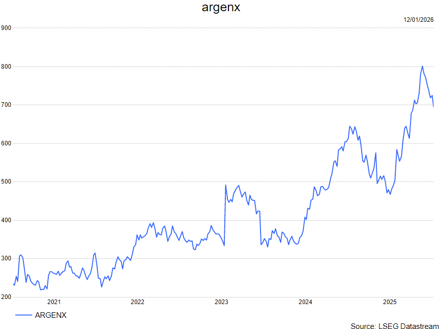 Argenx heeft zijn strategische prioriteiten voor 2026 uiteengezet en voorlopige wereldwijde Vyvgart‑verkopen voor 2025 gedeeld, die uitkomen op ongeveer 4.15 miljard dollar, vrijwel in lijn met de gemiddelde analistenverwachting van 4.13 miljard dollar. Het jaar 2026 belooft bijzonder belangrijk te worden, met vier registratiestudies die cruciale gegevens zullen opleveren en meerdere pipeline‑ontwikkelingen die verder worden verfijnd. Dat schrijft KBC Securities‑analist Jakob Mekhael, die benadrukt dat de pipeline versneld verbreedt en dat argenx in een unieke positie blijft om verdere groei te realiseren.