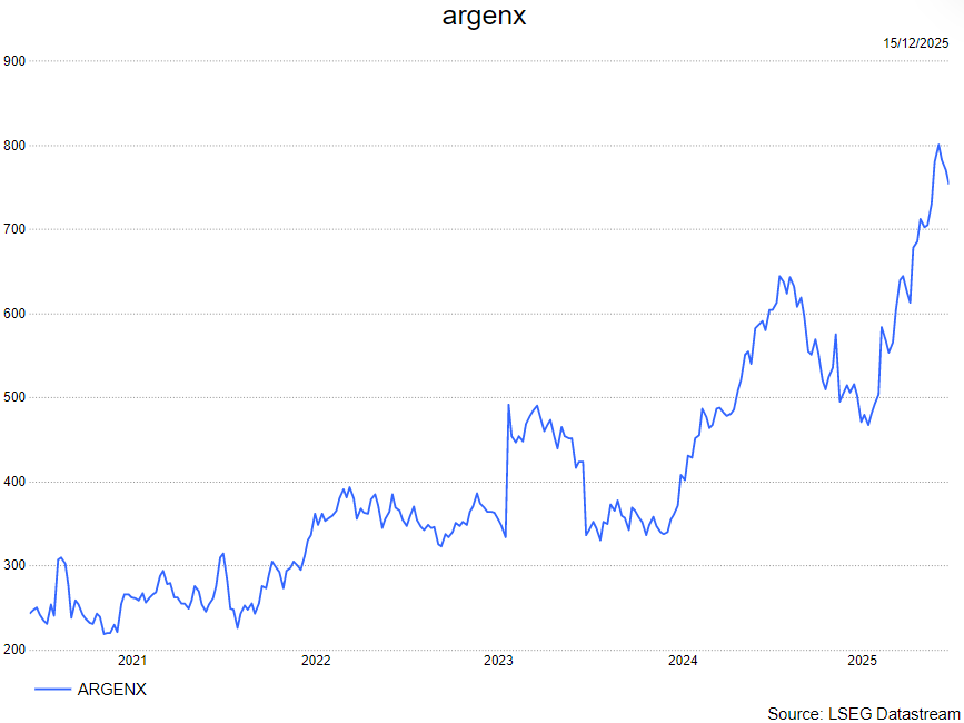 De Belgische biofarmaspeler argenx heeft aangekondigd dat de fase 3-studies (UplighTED) met Vyvgart subcutaan voor patiënten met matige tot ernstige thyroid eye disease (TED) worden stopgezet na een interim-analyse die onvoldoende werkzaamheid aantoonde. Het bedrijf benadrukt dat deze uitkomst past binnen een pipeline-strategie die rekening houdt met risico’s en uitval, en dat verdere analyse van de data volgt. Aldus KBC Securities-analist Jacob Mekhael, die eventuele koerszwakte vandaag als een koopkans ziet.