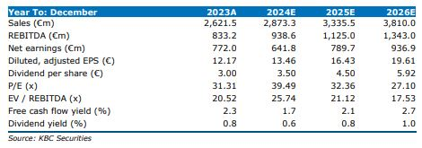 Bijgevolg was de nettowinst van 179 miljoen euro boven de consensus van KBC Securities en de gemiddelde analistenverwachtingen (gav) (KBCSe 131 miljoen euro en gav 136 miljoen euro. Bovendien heeft ASMi de vooruitzichten voor het tweede kwartaal 2024 verhoogd en verwacht het een groei van 10% of meer voor de tweede jaarhelft 2024. De beter dan verwachte resultaten bieden ruimte voor winstnemingen.