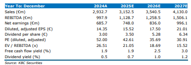 KBC Securities-analist Thibault blijft positief over ASMi en bevestigt dat het bedrijf zijn voorkeurskeuze is binnen de halfgeleidersector, boven ASML en Besi. Ondanks de hoge waardering van de sector ziet hij in ASMi een solide langetermijninvestering. Zijn waardering is gebaseerd op een koers-winstverhouding van 27 keer de verwachte verwaterde winst per aandeel van 21,0 euro in 2027.