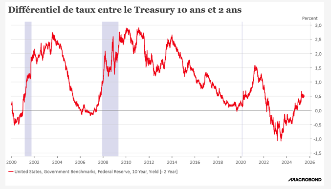 Ook interessant is dat de rentecurve steiler wordt, gezien het verschil tussen het rendement op 2- en 10-jaars Treasuries.