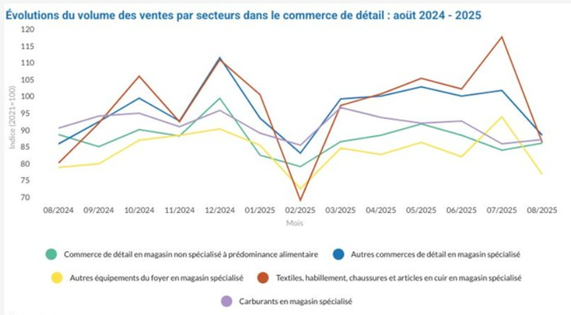 In dat verband publiceerde Statbel gisteren het cijfer over het volume van de detailhandelsverkopen in België, en deze zijn in augustus met 7% gedaald ten opzichte van de vorige maand. Deze daling trof bijna alle winkels, met een afname van 26,4% in de sectoren textiel, kleding, schoenen en lederwaren, 18% voor andere huishoudelijke uitrusting en 12,9% voor andere detailhandelszaken. Op jaarbasis daalde het verkoopvolume in de detailhandel, exclusief brandstoffen, met 0,4%, met aanzienlijke verschillen per sector zoals de grafiek laat zien.