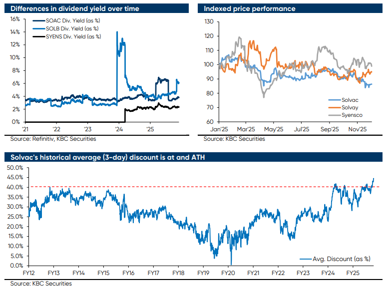 De blended dividend yield (gemiddeld dividendrendement) is na de opsplitsing van Solvay in Solvay en Syensqo fors gedaald, en de aandelen zijn enkel beschikbaar in geregistreerde vorm, wat administratieve drempels opwerpt, vooral voor internationale en institutionele beleggers.