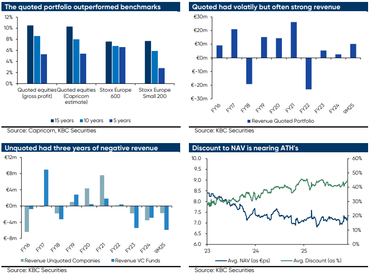 Recent kondigde het management een strategische verschuiving aan: minder focus op de goed presterende beursgenoteerde portefeuille en meer allocatie naar de onderpresterende private/VC-investeringen. Dat gaat gepaard met een kapitaalreductie van €18,7 miljoen, gefinancierd door verkoop van beursgenoteerde holdings, waardoor het vehikel verder krimpt.
