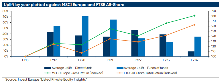 De Europese markt voor beursgenoteerde private equity (PE) wordt vaak met scepsis bekeken, vooral wat betreft de betrouwbaarheid van de intrinsieke waarde (NAV) van beursgenoteerde PE-vehikels. Het recente rapport van Invest Europe analyseerde exit*-uitkomsten versus de laatst gerapporteerde fair value (“exit uplift**”) over honderden exits tussen 2019 en 2024.
