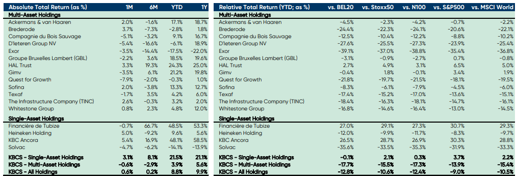 Tijdens november 2025 realiseerde het KBCS Holdings Universe een totaalrendement van 0,6%, voornamelijk gedreven door de prestaties van de monoholdings (+3,1%), terwijl de gewone holdings een rendement van -0,6% lieten zien. De drie beste presteerders in deze periode waren KBC Ancora (+5,4%), Heineken Holding (+5,0%) en Brederode (+3,7%), terwijl de drie slechtste presteerders Quest for Growth (-7,9%), D’Ieteren (-5,4%) en Solvac (-4,7%) waren. - Over 2025 tot eind november