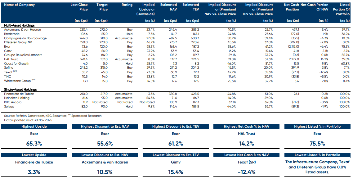 In november 2025 kromp de korting van het KBCS Holdings Universe met 0,1% tot 29,9%. De korting van gewone holdings kromp met 0,3% tot 31,5%, terwijl die van mono-holdings steeg met 0,4% tot 26,7%. De grootste kortingkrimp was er voor HAL Trust (-2,6%), Whitestone Group (-1,9%) en KBC Ancora (-1,7%), terwijl de discount het meest toenam voor Gimv (+5,2%), Solvac (+4,3%) en Financière de Tubize (+3,7%).