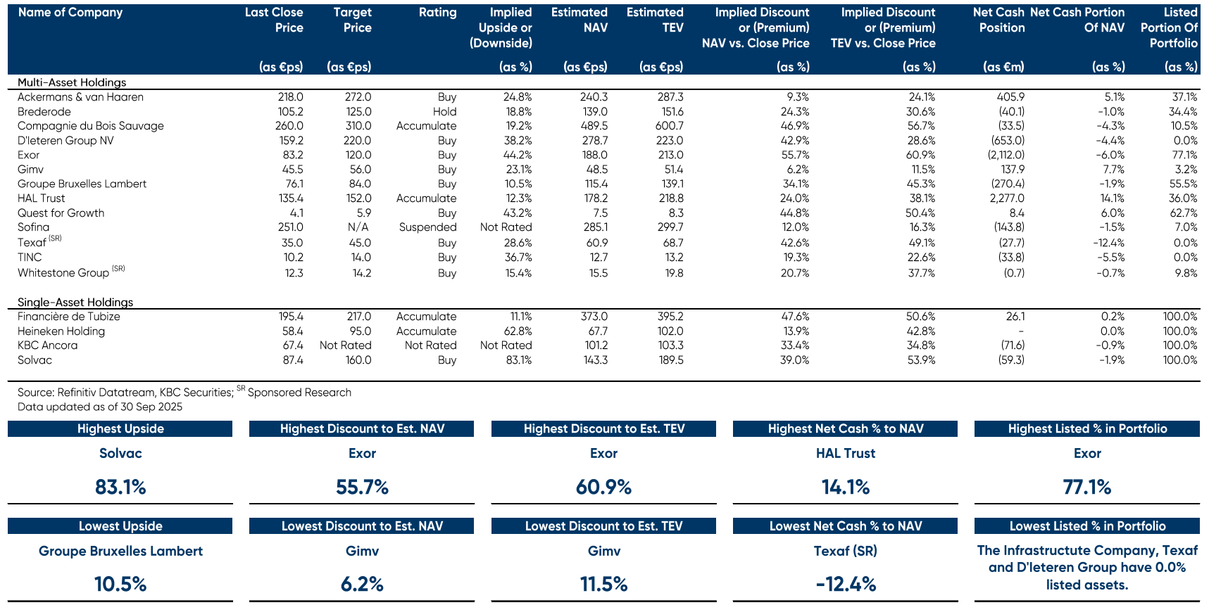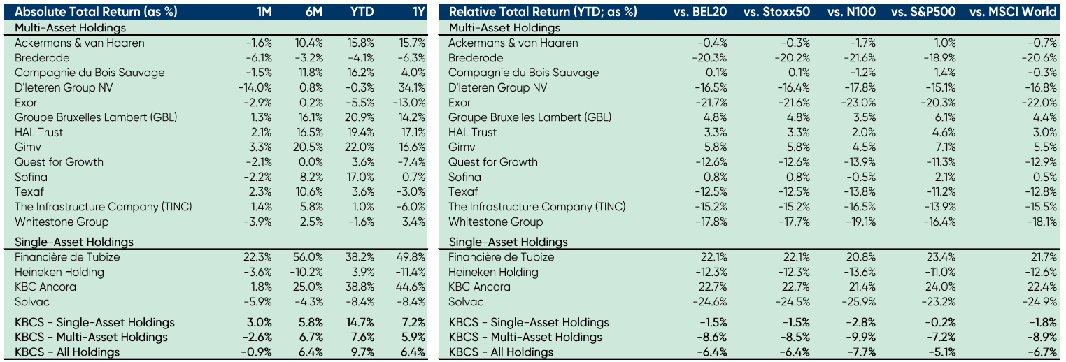 Over de afgelopen maand boekte het universum van de door KBC Securities opgevolgde holdings een rendement van -0,9%, dat ondanks de prestatie van de monoholdings (+3%), terwijl de gewone holdings gemiddeld met -2,6% zakten. De 3 best presterende holdings waren Financière de Tubize (+22,3%), Gimv (+3,3%) en Texaf (+2,3%), terwijl de 3 slechtst presterende bedrijven D'Ieteren (-14%), Brederode (-6,1%) en Solvac (-5,9%) waren. - Over 2025 tot eind september