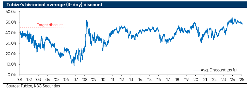 De kortingen van Tubize ten opzichte van de NAV*’s (€373,0) en TEV*’s (€395,2) bedragen respectievelijk 47,6% en 50,6%, terwijl het 2-jarig gemiddelde 48,6% bedraagt, maar boven het 5-jarig gemiddelde (43,4%). Na achter te zijn gebleven op UCB-rally in november 2023, is de korting van Tubize recent fors verkleind. Toepassing van een korting van 45% op TEV’s geeft een koersdoel van 217 euro. Dit impliceert een beperkt opwaarts potentieel.