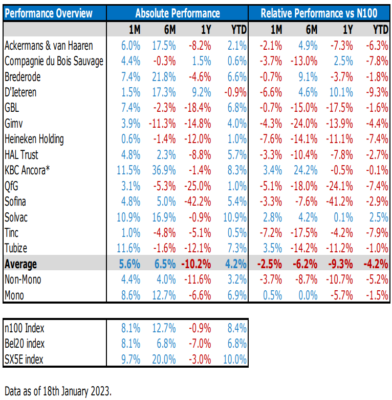 Traditioneel noteren de meeste holdings met een korting op hun werkelijke waarde. Alle holdings samen noteren op 18 januari aan een gemiddelde korting ('discount') ten opzichte van hun geschatte intrinsieke waarde van 22,6%. Dat is iets minder dan de 24,5% van een maand eerder. Die beweging werd voornamelijk veroorzaakt door de holdings, die vandaag aan een gemiddelde korting noteren van 20,2% (tegenover 28,2% voor de monoholdings).