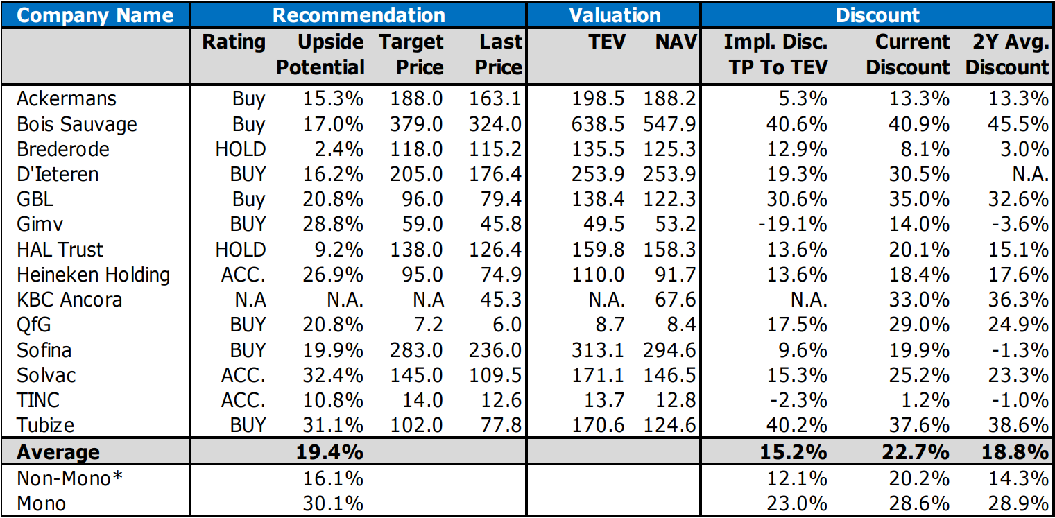 Hieronder vind je een tabel opgesteld door Sharad met zijn advies en koersdoelen voor de Belgische holdings. In de derde kolom staan per holding de TEV en de NAV. TEV = de huidige geschatte waarde van de portfolio door KBC Securities (incl. eigen waarderingen voor de private belangen). NAV = de laatste, door de holding zelf gepubliceerde waarde aangepast met de koersverschillen van de beursgenoteerde participaties. De vierde kolom behandelt de korting (discount) per holding, waarbij TP staat voor Target Price (koersdoel) en vind je ook de gemiddelde korting voor de laatste twee jaar terug (2Y Avg. Discount).