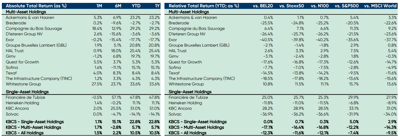 Op jaarbasis (t/m eind december ’25) boekte de KBCS Holdings‑Universe een totaalrendement van +8,2%, vooral gedreven door monoholdings (+19,6%), terwijl gewone holdings gemiddeld +3,8% noteerden. Vergeleken met relevante indices presteerde de KBCS Holdings‑Universe minder goed dan de BEL20, Stoxx50, N100, S&P500 en MSCI World met respectievelijk ‑10,9%, ‑10,1%, ‑14,3%, ‑8,2% en ‑9,8%. De beste presteerders t.o.v. de BEL20 waren Financière de Tubize (+27,7%), KBC Ancora (+26,1%) en Whitestone Group (+14,5%); de zwakste t.o.v. de BEL20 waren Exor (‑37,3%), Solvac (‑36,4%) en D’Ieteren (‑23,3%).