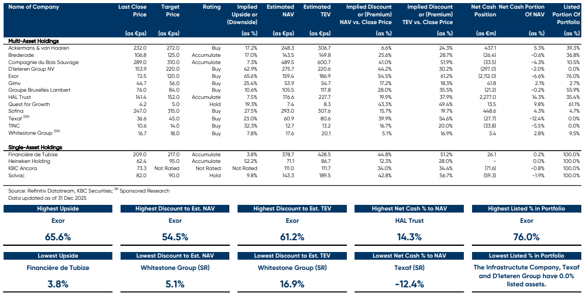 Tijdens december ’25 kromp de korting van de KBCS Holdings‑Universe met 1,0% tot 28,9%. De korting van gewone holdings kromp met 1,2% tot 30,3%, terwijl die van monoholdings met 0,8% daalde tot 25,9%. In december ’25 kromp de korting het meest voor Whitestone Group (‑20,6%), Compagnie du Bois Sauvage (‑7,1%) en Ackermans & Van Haaren (‑4,6%), terwijl ze het meest toenam bij KBC Ancora (+1,8%), Quest for Growth (+1,3%) en Gimv (+1,1%).