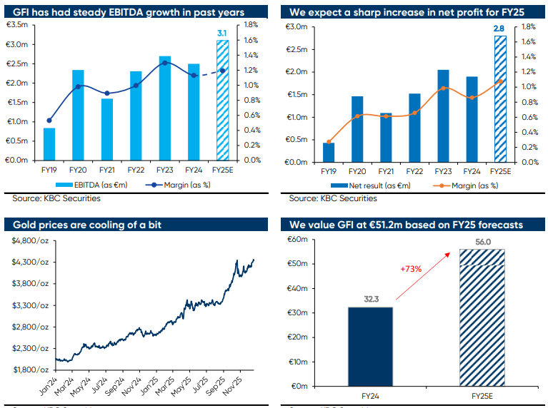 GFI (Gold & Forex International), een kernparticipatie van Whitestone Group, is in korte tijd getransformeerd van een defensieve hedge naar een ware groeimotor. GFI kende de afgelopen jaren een gestage EBITDA-groei en KBC Securities verwacht een scherpe stijging van de nettowinst in 2025.