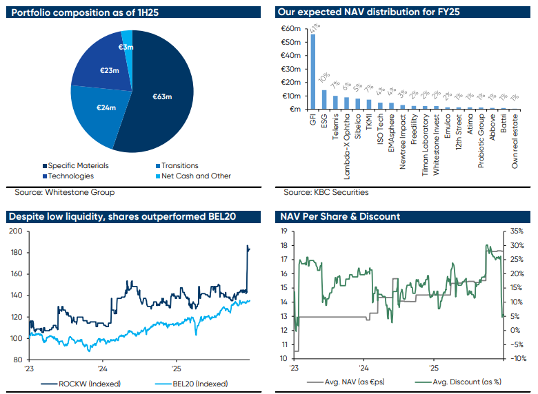 KBC Securities schat dat de waardering van GFI tegen eind 2025 stijgt naar 56 miljoen euro (+73% jaar-op-jaar). Daarnaast is er Whitestones schone balans, consistente outperformance en geloofwaardige groeiplan tot 2030, wat moet zorgen voor een lagere korting. Het koersdoel voor Whitestone wordt daarom verhoogd van 15 naar 18 euro.