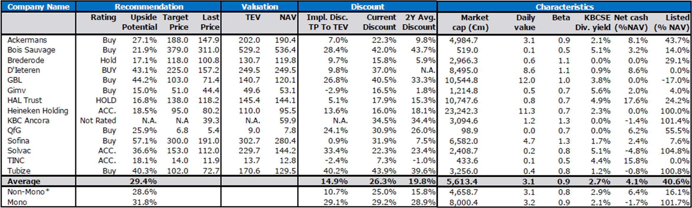 Hieronder vind je een tabel opgesteld door Sharad met zijn advies en koersdoelen voor de Belgische holdings.