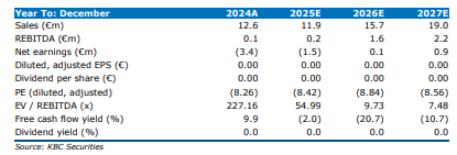 De KBC Securities-analist ziet in de samenwerking met Sol.One een belangrijke strategische stap voor Crescent. De focus op defensie, AI en geavanceerde RF-technologieën past binnen een duidelijke groeistrategie. Ondanks een bescheiden omzet van 12,6 miljoen euro in 2024 en een nettoverlies van 3,4 miljoen euro, verwacht Crescent een omzetgroei tot 19 miljoen euro in 2027, met een positieve REBITDA van 2,2 miljoen euro. De analist merkt op dat Crescent beschikt over een sterke balans en vrije kasstroomgeneratie, wat ruimte biedt voor strategische investeringen. De aanbeveling en het koersdoel voor Crescent blijven onder herziening.